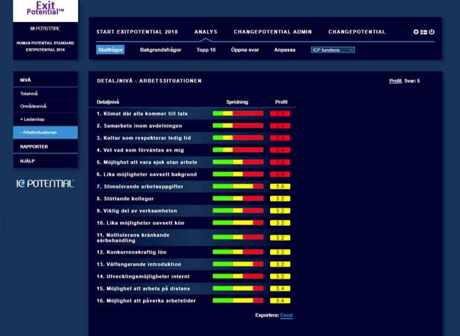 I ExitPotential™ kan ni analysera resultatet från medarbetare som har avslutat sin anställning. Analysverktyget ger er bättre förståelse för hur ni kan behålla värdefulla medarbetare och vilken bild de som avslutat sin anställning bär med sig av organisationen.