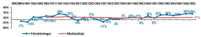 Andelen personalchefer som tror på en ökad sysselsättning inför det kommande kvartalet ligger på 41 % och andelen som tror på en minskad sysselsättning ligger på 12 %. Jämfört med tredje kvartalet, 2015, så har andelen som tror på en ökning ökat med 5 procentenheter.